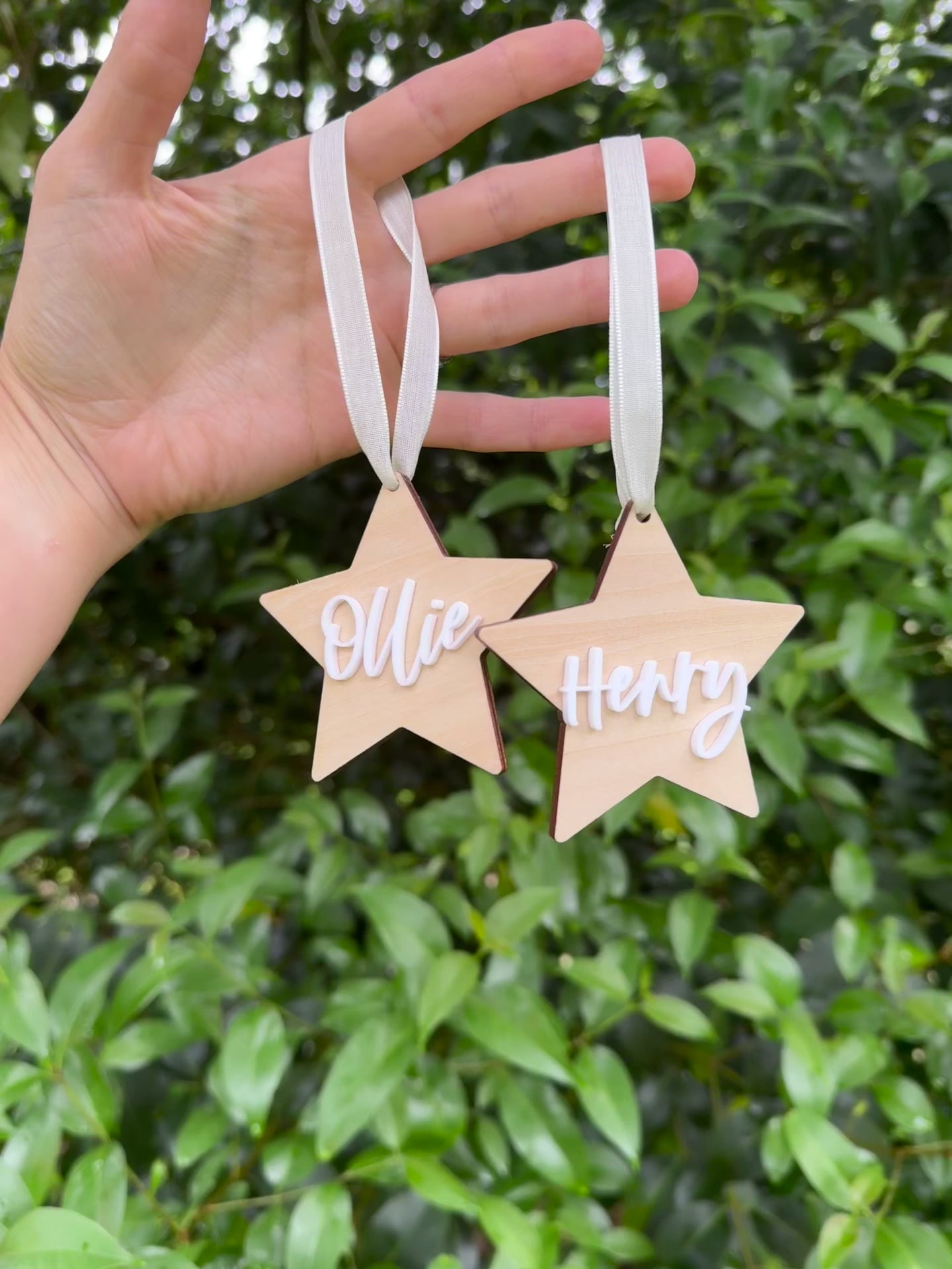Each ornament is hand-created with natural basswood timber and 3mm white gloss acrylic, and features a white shimmery soft-wire ribbon.