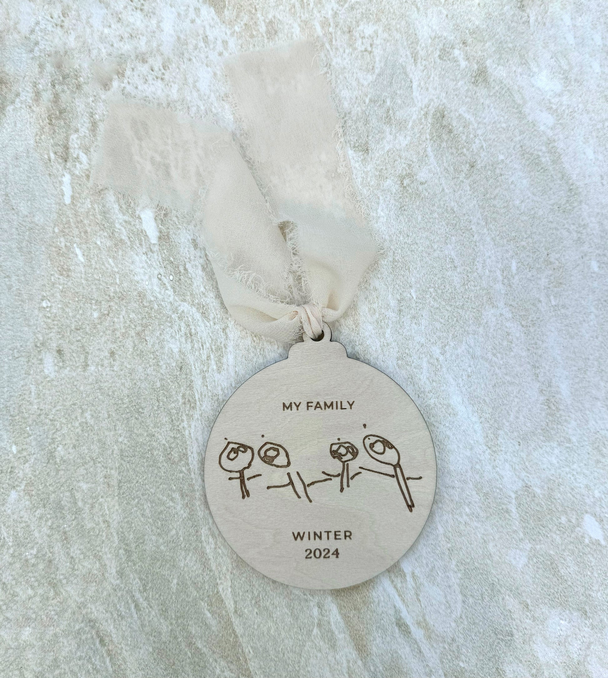 Your children's artwork is engraved into natural basswood timber, and also features a gorgeous hand-frayed chiffon ribbon.